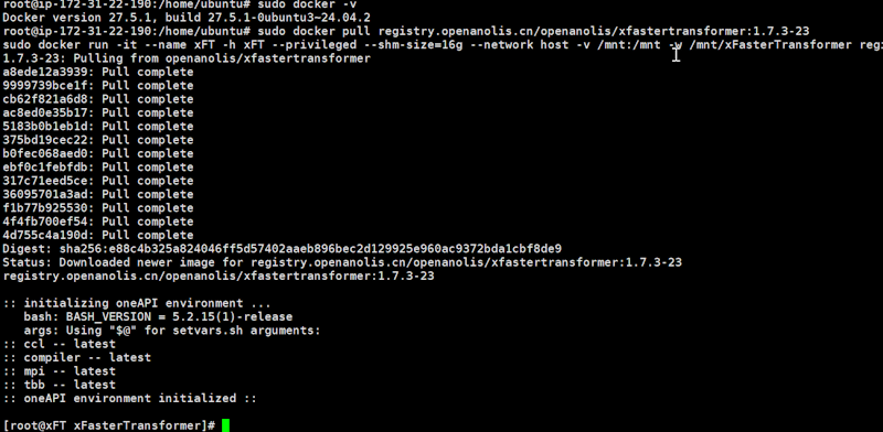 sudo docker run -it --name xFT -h xFT --privileged --shm-size=16g --network host -v /mnt:/mnt -w /mnt/xFasterTransformer registry.openanolis.cn/openanolis/xfastertransformer:1.7.3-23