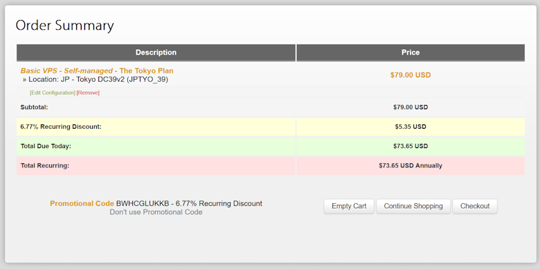 今天老左有看到搬瓦工VPS主机商推出日本东京 The Tokyo Plan VPS套餐,年付79美元,配置AMD CPU ,1GB内存、20GB硬盘,2.5G大带宽,以及500GB月流量。线路上采用的是日本东京 DC39v2 机房直连线路新机型,混合多个上有服务商。说明白一点,就是三网直连线路,回程接入CMI直连。