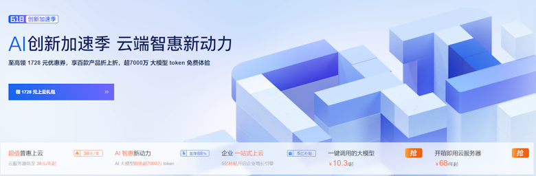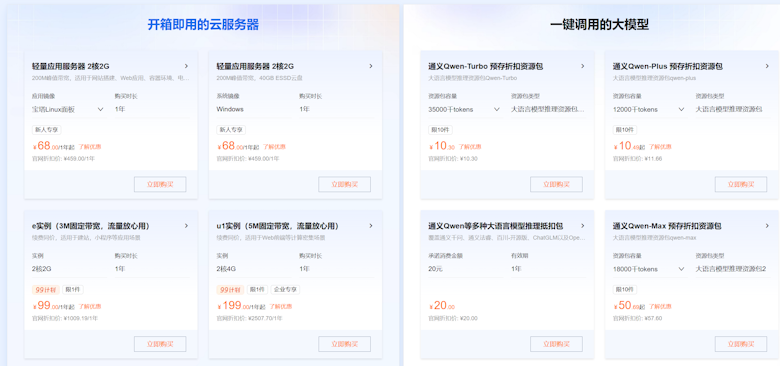 我们可以看到轻量服务器低至68元一年,还有大模型包。