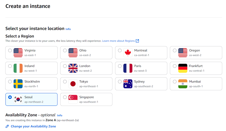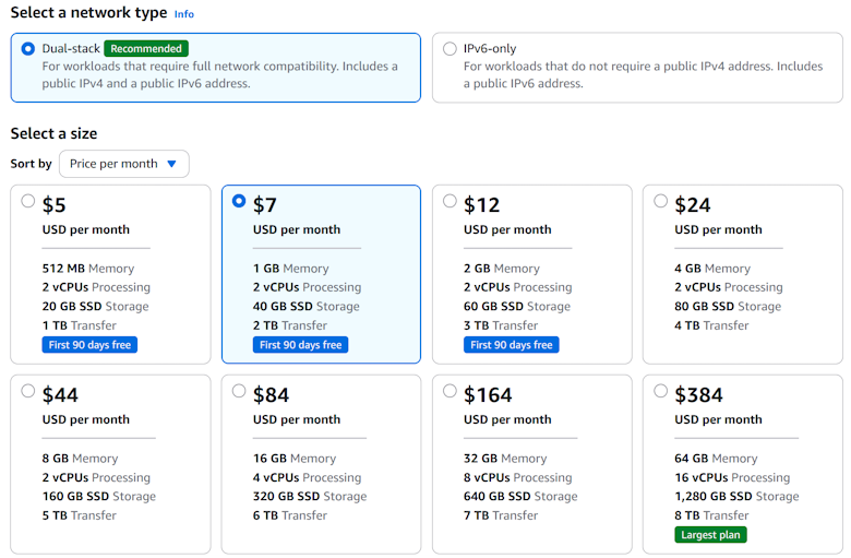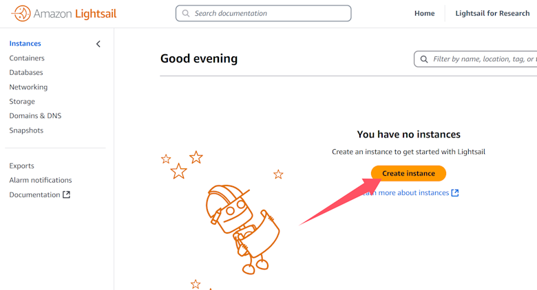 这里我们在注册完毕亚马逊云账号之后,可以找到 Lightsail ,可以 Create instance 创建。