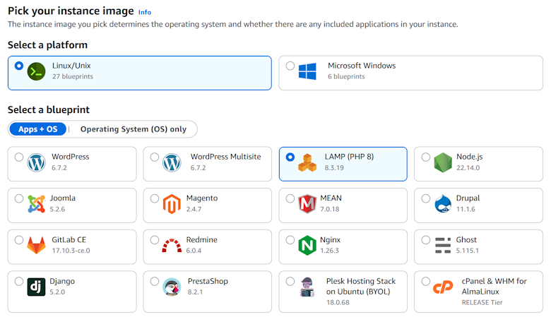 如图所示,我们选择 Linux服务器,然后对应有内置很多应用,包括Joomla、WordPress、Mgaento、Drupal等等,这里我们需要安装的是LAMP一键包,默认是带有PHP8版本的。
