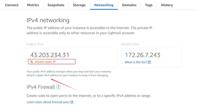默认的Public IPV4地址是动态的,如果我们重启服务器后会变化的,所以如果我们需要正常的生产环境则需要一个固定的静态IP。