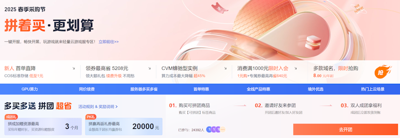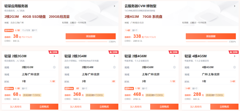 限时秒杀活动,轻量服务器低至38元一年,云服务器CVM年付低至338元。