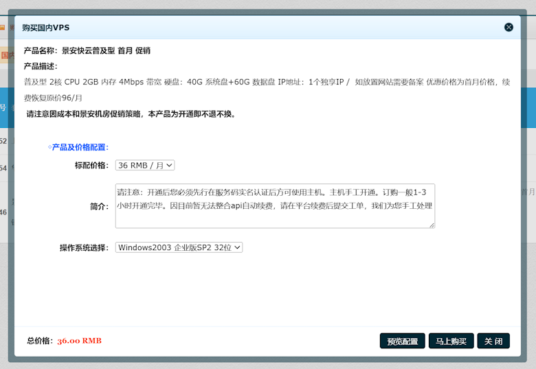 备注:请注意因成本和景安机房促销策略,本产品为开通即不退不换。