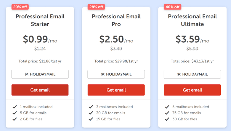 我个人就是在用他们家的企业邮局的,有根据不同的存储空间和用户数的多少区别三个套餐。基础套餐0.99美元每月的企业邮局还是相当便宜的。用到优惠码:HOLIDAYMAIL