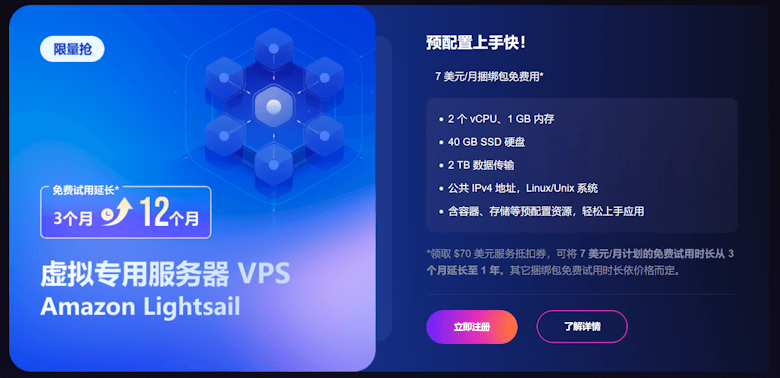 我们在前面的多篇文章介绍亚马逊云科技的时候,都有提供对于新客用户有提供100+的云服务产品,其中包括EC2云服务器12个月、一年S3对象存储、永久免费CDN服务等产品。在这个月,看到亚马逊云科技有提供针对年终福利的活动,有限量的70美金折扣券领取,然后可以根据要求去升级LightSail轻量服务器产品。我们要知道原本的LightSail轻量服务器是免费三个月的,如果领取到70美金的折扣券可以升级到免费12个月。
