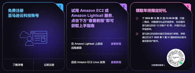 此活动面向于 2024 年 11 月 20 日 00:00:00 至 2024 年 12 月 31 日 23:59:59 期间(以 12 位 ID 在亚马逊云科技系统中显示时间为准)新注册并显示激活的账户(需完成完整的 6 步账号注册流程),并使用此账户试用 Amazon EC2 或 Amazon Lightsail 服务的用户,可参与此次礼品领取。