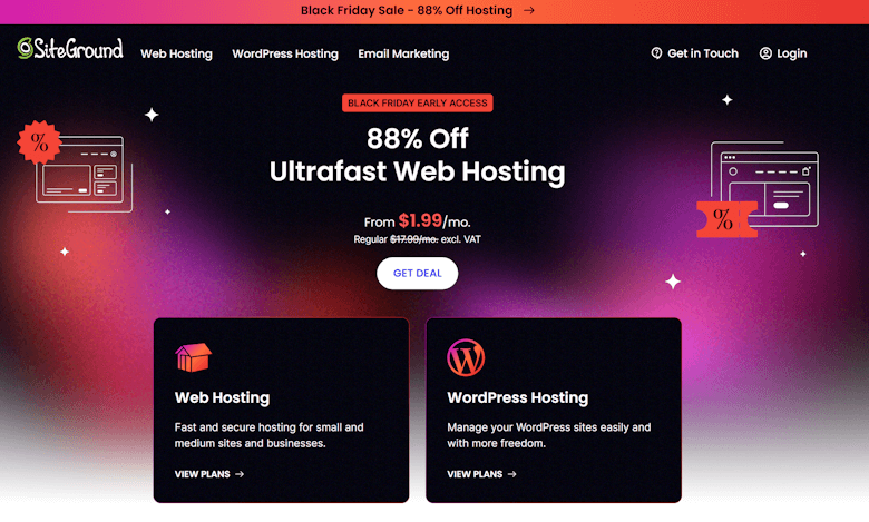 对于SiteGround虚拟主机商我们很多做外贸独立网站的朋友应该看到很多朋友在用的。算是比较知名的外贸独立站虚拟主机,比较苛刻的只有支持信用卡付款方案,有欧美亚洲等多个机房可选。超过20年的历史的服务商,这次黑五活动期间推出88% OFF的优惠力度,算是比较大的力度。