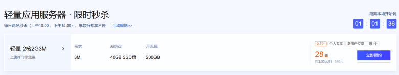每天两次的秒杀促销活动,可以看到最低的3M轻量服务器低至年付28元,这个价格真的着实的便宜。