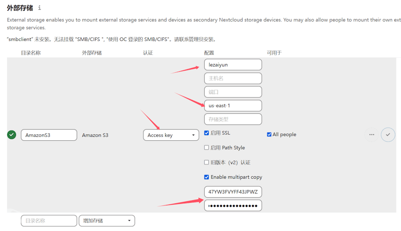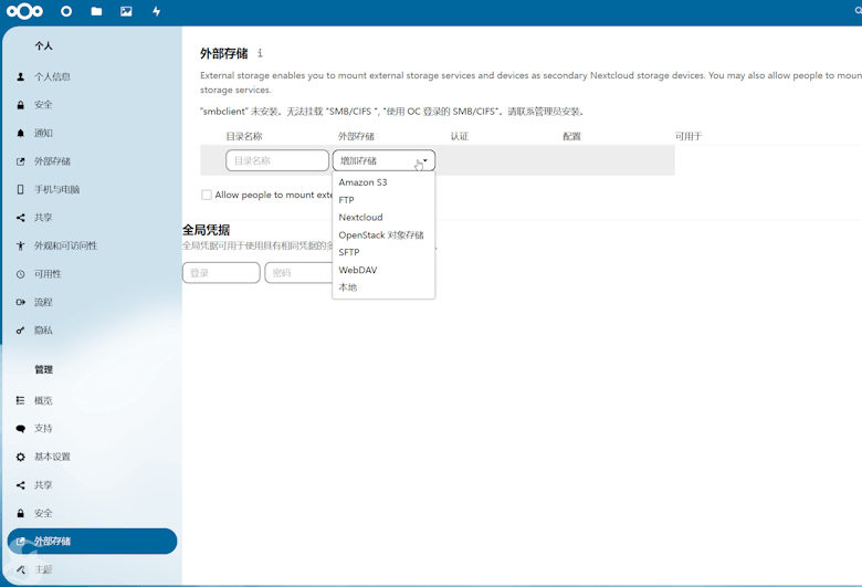然后我们在外部存储中选择S3网盘,当然如果我们有自定义FTP空间,或者SFTP也是可以用的。
