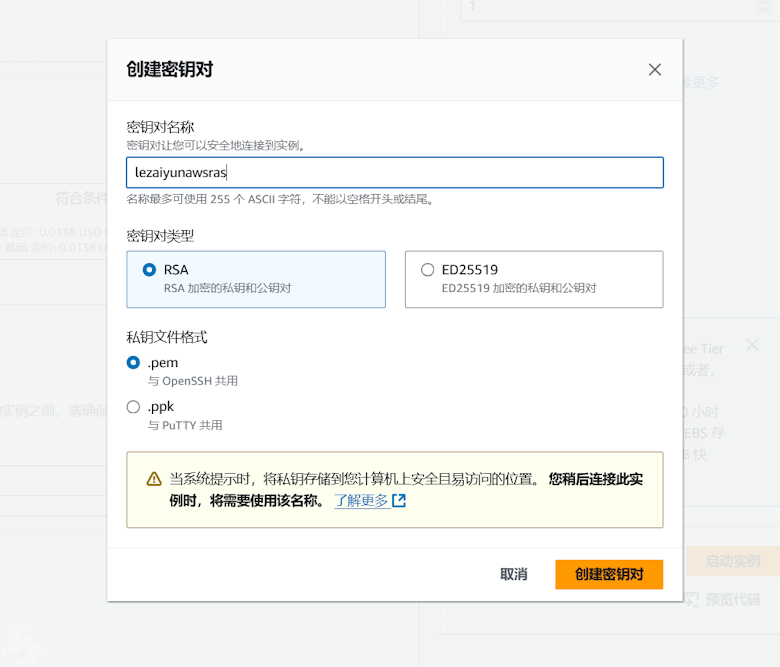 设置密钥对名称,然后创建后有一个密钥对文件下载到本地,我们登录SSH的时候导入即可。