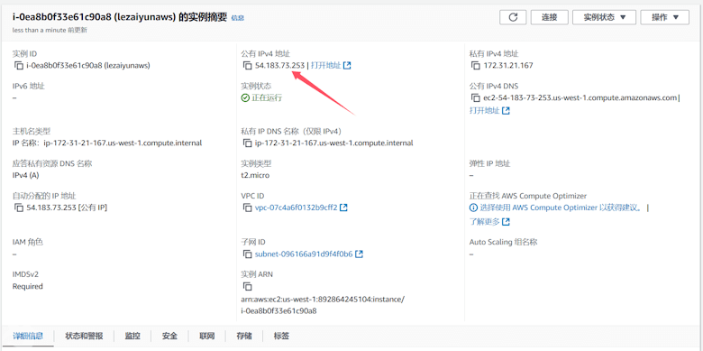看到亚马逊云分配给我们的IP地址,这里的地址我们需要用到的。