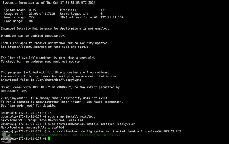 sudo nextcloud.occ config:system:set trusted_domains 1 --value=54.183.73.253