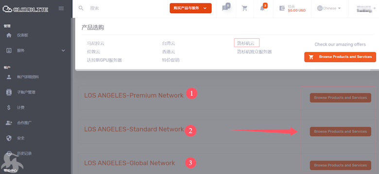 分别是 LOS ANGELES Premium NetWork、LOS ANGELES Standard Network、LOS ANGELES Global Network。一般我们较多的会选择Premium方案计划优化线路,而且2GB内存及以上才可以选择WiNDOWS系统,30M带宽不限制流量。
