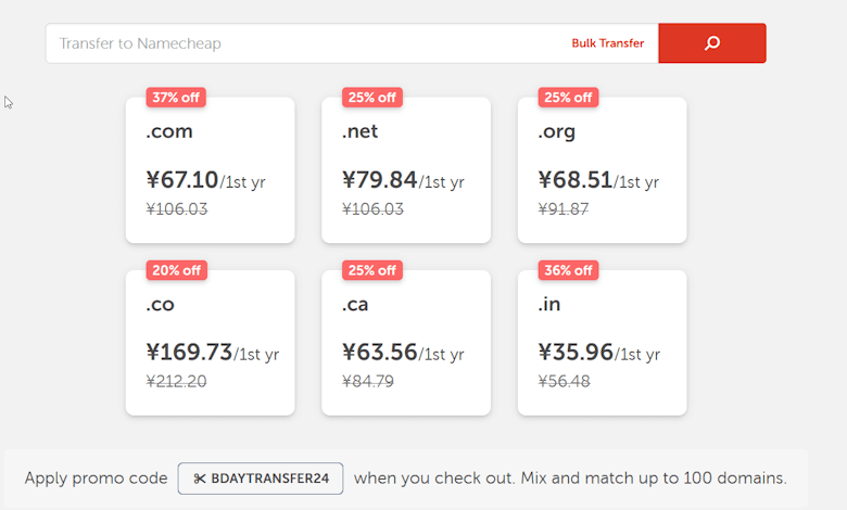 Namecheap 24周年转入域名优惠,比如.COM域名转入67元。