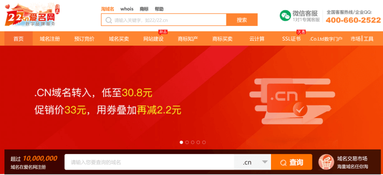 爱名网,也就是我们所谓的22服务商。这个服务商在国内还是比较久的,以前有在他们家注册不少域名,尤其是.CN域名是比较便宜的15-18元左右,而且以前服务超级好,如果你域名到期没有续费,他们会提前有客服联系到我们,如今好像是没有的。