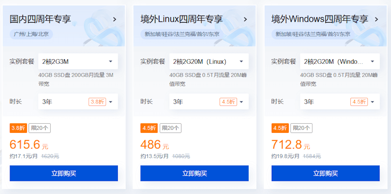 我们可以看到四周年的新购轻量服务器包括国内国外的多个套餐计划。低至3.8折,而且还有三年计划的。