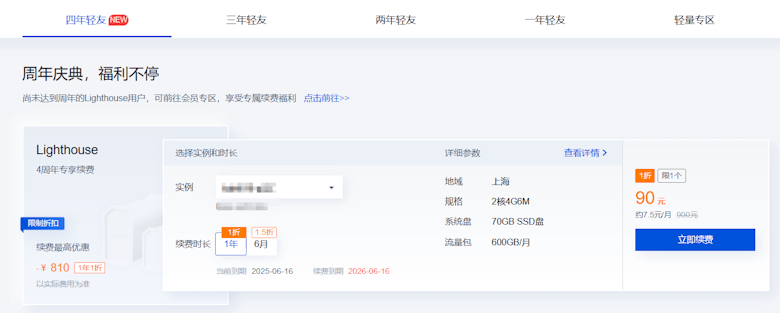 老左手上的有一台轻量服务器,符合四年计划的续费一年仅需要90元,还是很划算的,看看我们符合哪个计划。