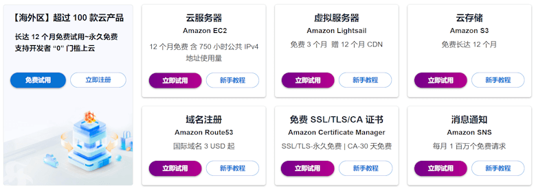 提到免费或者便宜的云服务器,我们可能就想到一些不靠谱的小众服务商。其实并不是这样子的,有些有实力的云服务器提供商,提供的便宜或者免费服务器稳定性更高的。随着市场化的需求,我们在之前可能很少看到有提供免费云服务器,可能会有七天的试用主机商。在这篇文章要介绍的是来自亚马逊云的福利,对于新客注册亚马逊云账号有赠送100+的免费体验云产品,其中包括一年(12个月)的云服务器产品。