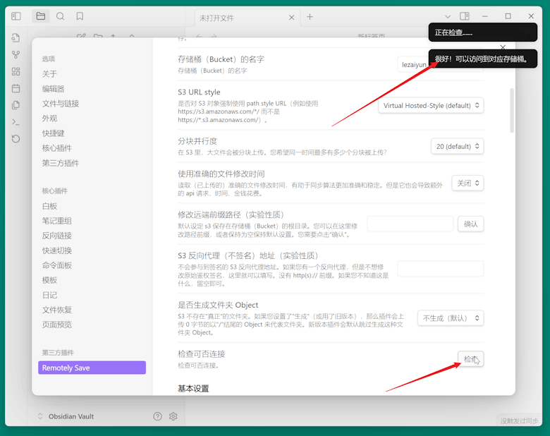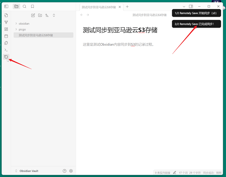 这里我们在Obsidian写笔记内容后点击左边的同步按钮就可以同步到S3。