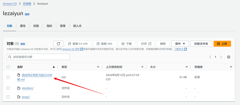 这样我们再回到S3存储空间中看到笔记的内容已经同步进来。