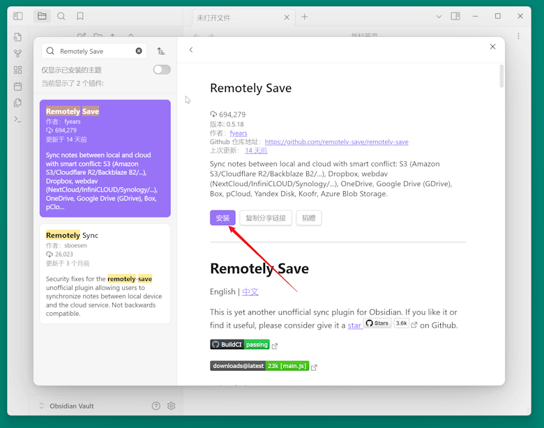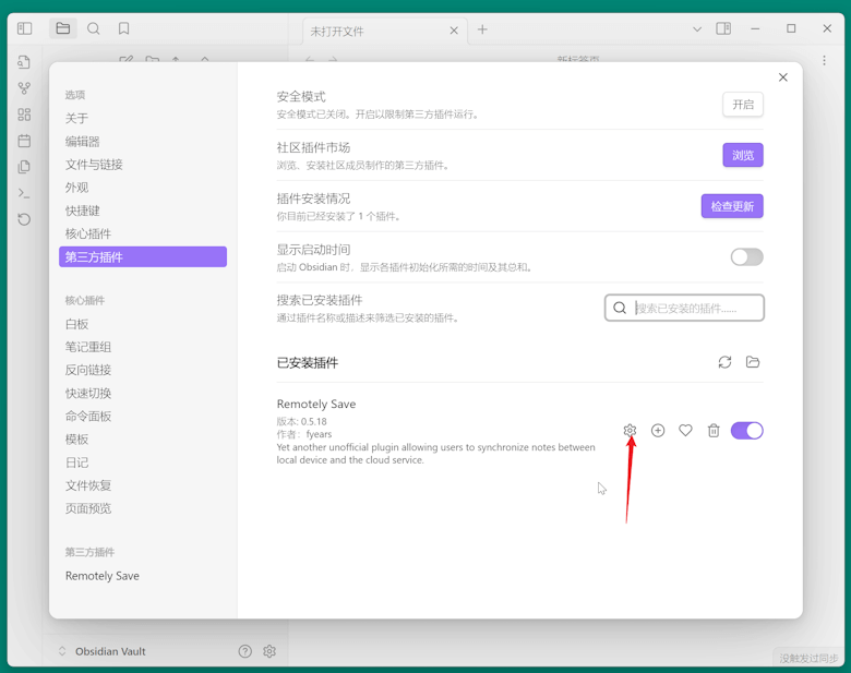 然后回到第三方插件,看到 Remotely Save 后点击按钮设置。