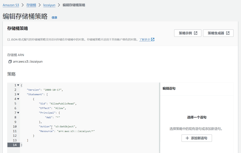 我们再回到上图中的 「权限」菜单。我们需要设置下面的 「存储桶策略」。