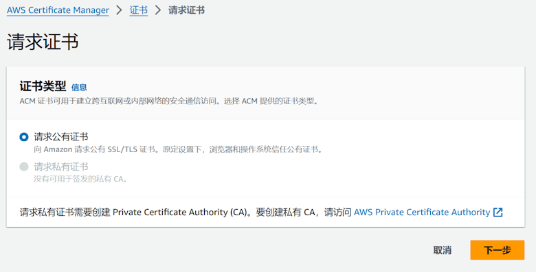 访问到亚马逊云的 「AWS Certificate Manager」,我们需要申请SSL证书。
