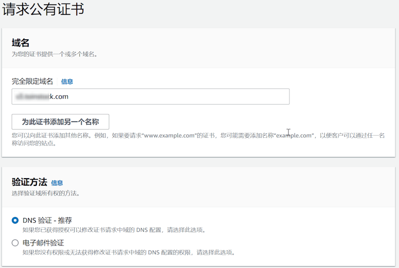 输入我们需要申请的证书域名,以及域名验证所有权方式可以选择DNS或者电子邮件验证。其他的默认即可提交。这里我用的是DNS验证。