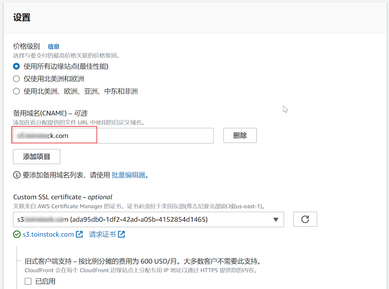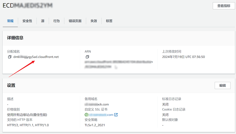 我们要知道,亚马逊云也有免费提供CDN服务,他们的CDN服务是CloudFront。我们创建CDN的时候可以选择到自己S3的云存储,主要是在上图这里,备用域名这里要输入我们的自定义域名。以及选择我们自定义的SSL证书,这样启动之后,我们可以看分配给我们的CDN的域名。