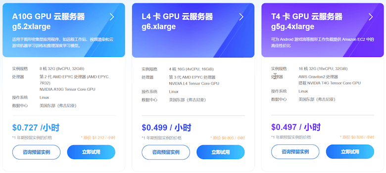 我们可以看到有提供多个GPU计算云服务器产品,而且都可以用小时灵活计费方式,我们适合满足大部分的云计算业务。