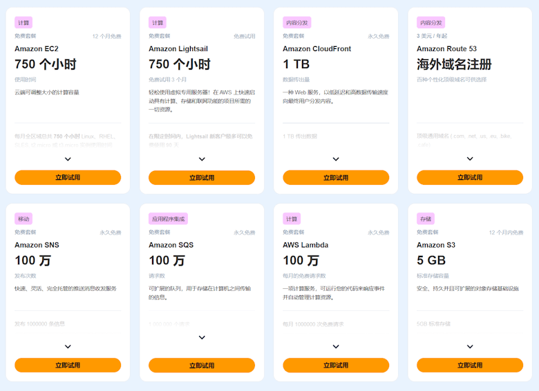 在此次的亚马逊云科技的活动中,我们可以看到适合新手用户的低价云服务,以及还有各种云服务应用的免费体验。