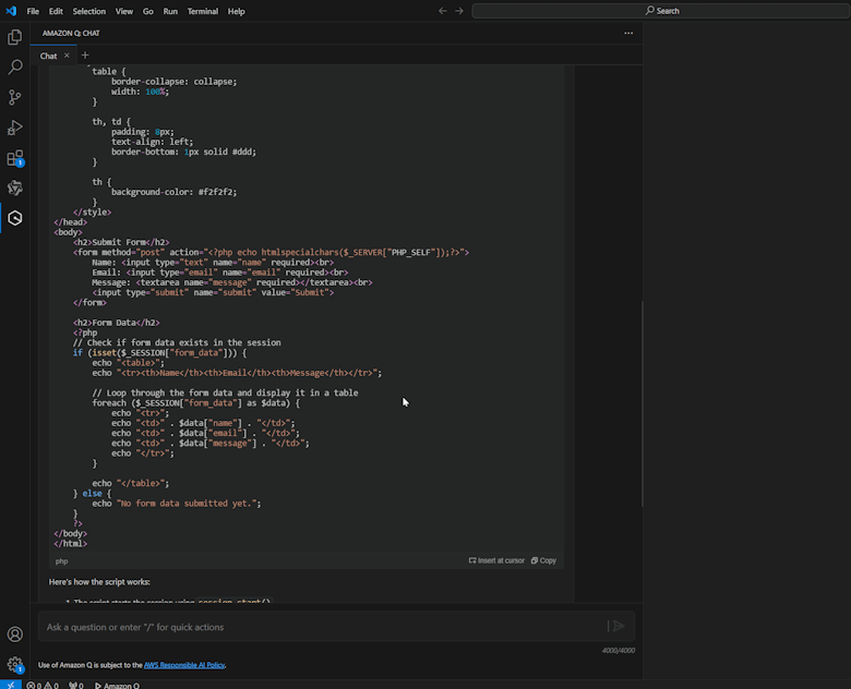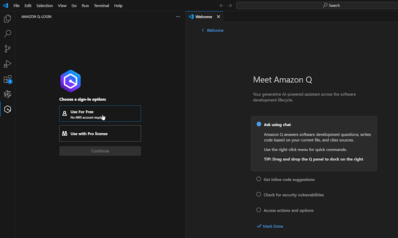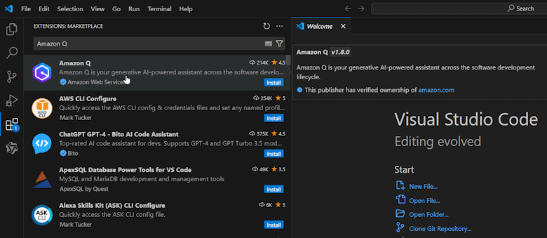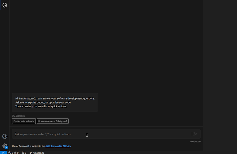 对于Amazon Q,有提供简单易用的 API 接口,开发人员可以轻松集成这些生成式AI功能到他们的应用程序中,从而实现自动化的文本生成和处理。在这篇文章中,我将记录利用VS CODE IDE工具实现编辑器的AI语言处理。