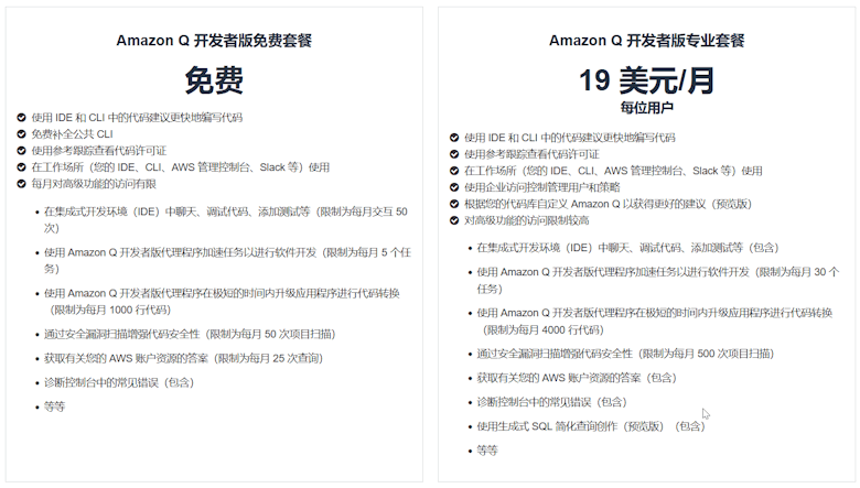 Amazon Q 开发者版提供两个定价套餐。在 2024 年 6 月 30 日之前免费试用 Amazon Q。 7 月 1 日之前不会向当前订阅用户收费。