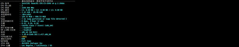 默认CPU为2696V4,使用KVM虚拟化,主频2.20GHz