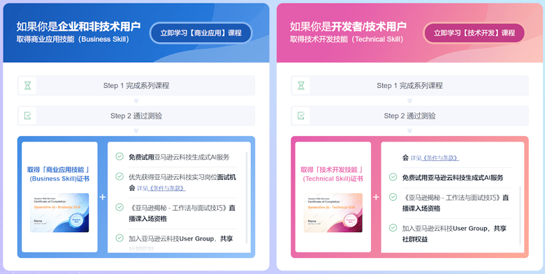 随着AI技能在各行各业的应用广泛,有很多的企业和岗位都需要招聘AI类的技能人员。市面上提供所谓的AI培训的并不专业而且不权威,在亚马逊云服务商目前有提供「生成式 AI 精英速成计划」,我们可以免费加入AI技能的学习且可以获取技能证书,当然还有机会获取人资主管教的面试技巧,以及有资格获取到优惠国际认证考试资格。