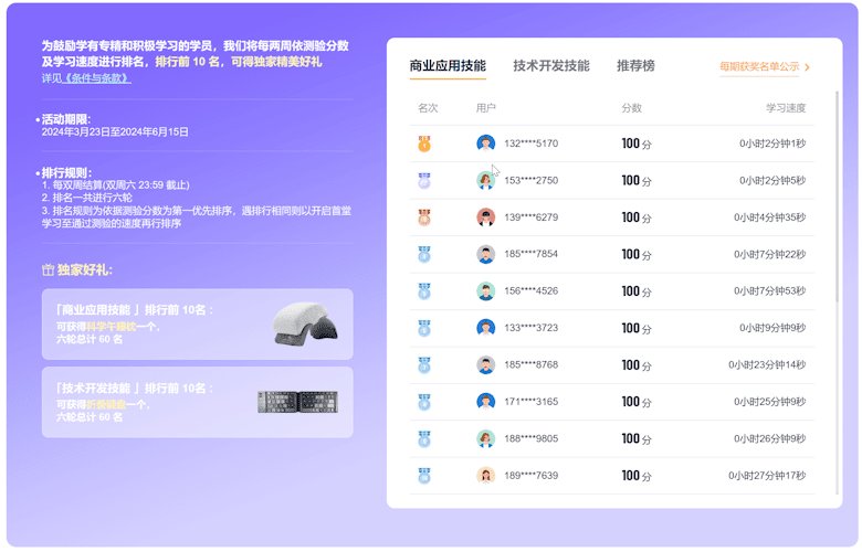 在学习之后有测试分值,然后根据分值和学习速度抽取好礼赠送。后续我们也有资格参与到直冲云霄训练营计划中,可获取亚马逊云科技的专属HR辅导、同行领域互助交流、认证考试指导等。