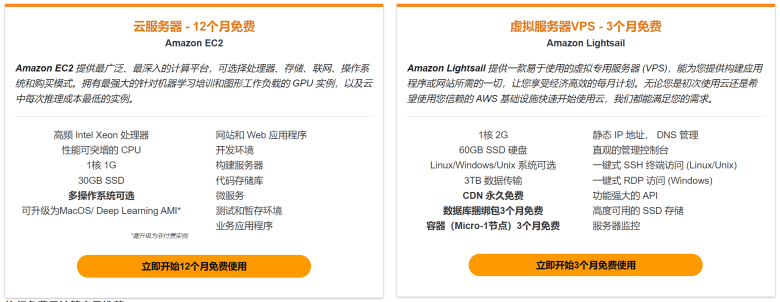 我们可以看到亚马逊云旗下有服务器、数据库、CDN、对象存储等上百款的云产品。对于新客用户有提供免费云服务器EC2最长12个月的时间,当然是限定的固定的套餐的,如果超过套餐的是需要额外计费的。对于入门级的我们选择免费套餐也是够用的。