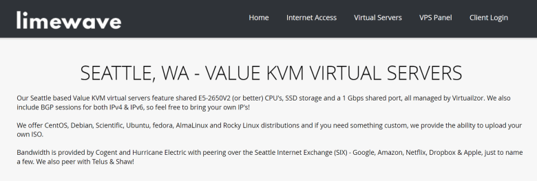 Limewave,这个海外主机商运营有多年,但是由于海外主机商太多,也没有特别的特点,所以估计很少有人看到过。这次黑五活动期间,有提供几款年付美国西雅图机房的VPS主机,如果有需要低价年付VPS主机的可以看看。