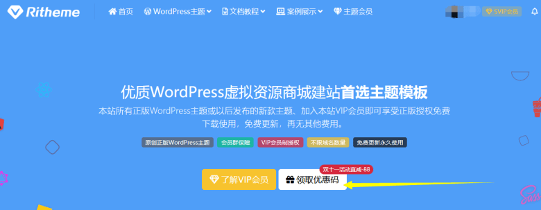 Ritheme主题我们有些朋友可能也有看到过,比较适合做资源下载和VIP资源类的网站,内置很多个支付接口且颜值也是不错的,基本无需二次开发前端。目前双十一期间,看到有提供官方的立减88元的优惠券,比平时是便宜的。Rithem主题的特点在于没有限制域名授权数量,我们只要是自己的站点,可以不限制次数和站点域名绑定授权。