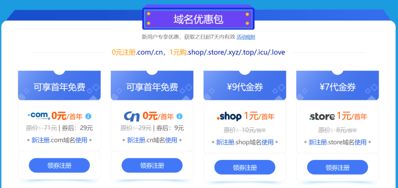 0元注册.com/.cn域名:新客户领取优惠券,可享.com域名29元/首年,.cn域名9元/首年。若所注册的域名在60天内完成备案且为企业网站,并确保网站能正常访问,相关费用会退至会员帐号,即首年0元注册。这个有点像阿里云企业用户首年低价COM域名优惠相似。