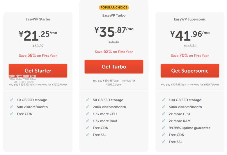 Namecheap WordPress主机方案包括EasyWP Starter、EasyWP Turbo、EasyWP Supersonic三款不同方案,均是采用的固态硬盘存储,提供免费CDN。