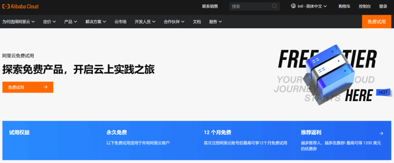 对于阿里云而言,算是我们国内用户量比较大的云服务商品牌,虽然这几年的活动力度不大,但是口碑,包括国际口碑还是有的。我打算以阿里云和亚马逊云国际站点的福利活动两者进行对比。