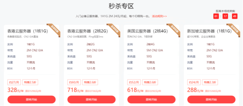| 1核1G | 2M CN2 | 香港 | 68/月 | 32/月 | 链接 |