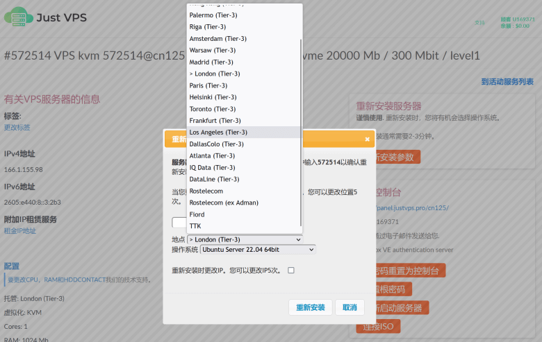 初次选择的时候会需要等待付款审核后才可以看到你开通的VPS。然后再安装系统参数的时候可以重新切换可选20+机房,以及系统。切换后IP也会随时改变。当然,切换机房的时候是属于重新安装系统,数据也会清空,所以有数据需要提前备份。