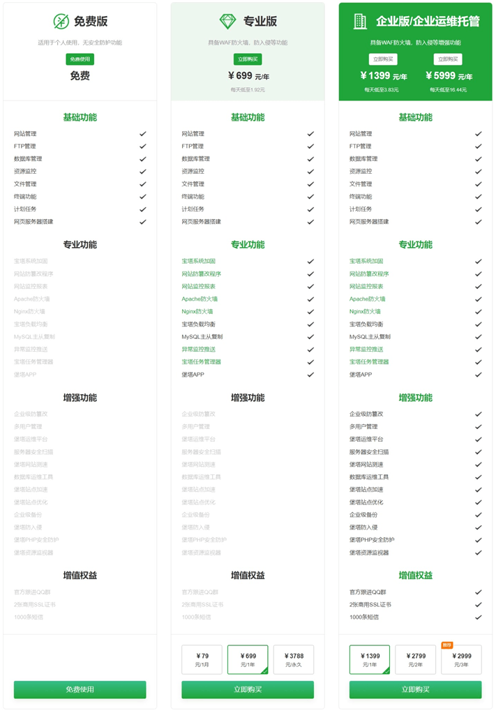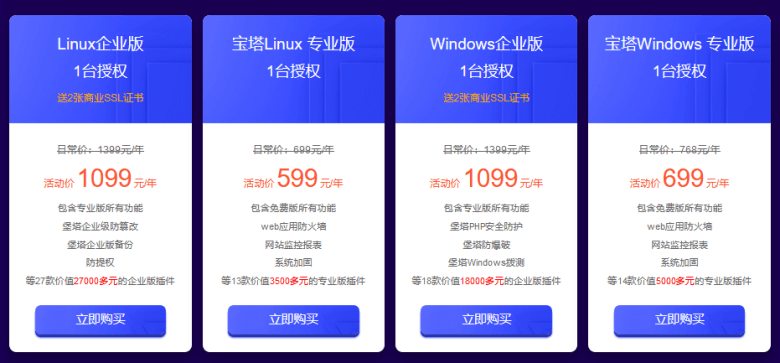 如今我们服务器部署网站环境较多还是喜欢用可视化面板,其中宝塔面板算是当前比较主流的面板之一而且特别适合我们国人的体验。虽然商家有提供免费版本,但是在加固安全和防御上是需要单独购买插件的。与其购买插件还不如直接入手专业版或者企业版。一般我们选择专业比较多,常规授权是年699元,当前618年中大促599元。当然如果我们准备长期使用的建议可以选择永久版本,或者多服务器选择多服务器授权永久版本。