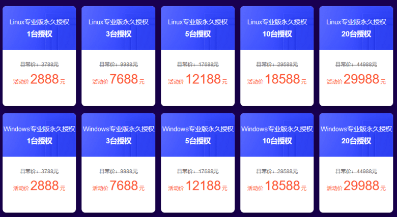 当前年中促销期间,单台授权年费599元起步,有区别Linux或者Windows系统的。如果我们服务器比较多或者长期用的,建议永久版,因为以后也支持更换服务器授权的,当然也可以找人合购分享授权,这样平摊便宜。