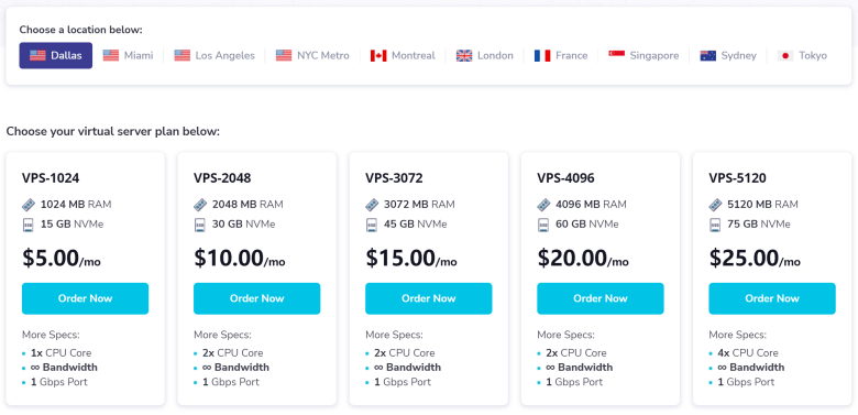 Tokyo, Japan – As of March 1st, 2023, plans are limited to 1TB bandwidth per 1GB RAM. After your monthly limit is hit your VPS will be limited to roughly 10Mbps. Additional high speed bandwidth can be ordered for $3.60 per 1TB.