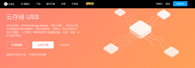 又拍云的时间和上面的七牛云相当,也是国内老牌提供云存储和加速服务的公司。又拍云云存储(USS)是一款快速、高可用、弹性伸缩的云端存储服务。它提供了多种存储类型,包括标准存储、低频访问存储(IA)、归档存储(Archive)等,以满足不同场景下的存储需求。USS 还支持多种安全验证方式,包括访问权限控制、HTTPS 协议传输等。