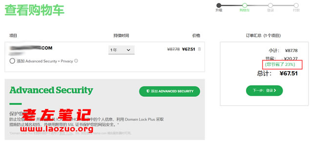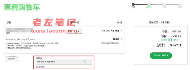 这里有一个小技巧,我们在选择域名的时候可以先购买且用优惠码折扣抵扣付款。对于隐私保护免费券,我们可以在域名购买之后再添加订单,因为优惠码不同且不可以叠加使用。